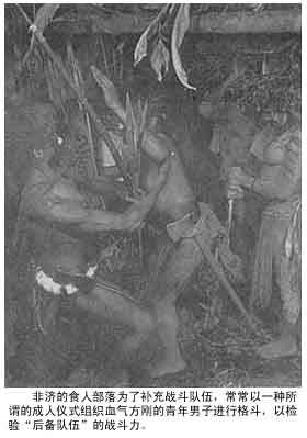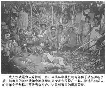 在冬季的第一个月,威尔逊他们步人了以刚果盆地为中心的赤道非洲森林地带。虽是冬季,但热带雨林深处带给他们的仍是难以忍受的炎热。为了行程的方便,威尔逊在当地的俾格米人中雇佣了一名叫拉特尔的中年男子作向导。 据拉特尔介绍,俾格米人分为四大群体:赛加人、特瓦人、羞色拉人和姆布带人。主要分布在几内亚、喀麦隆、加蓬、刚果、安哥拉、扎伊尔等国家。俾格米人主要靠狩猎为生,每次集体出征狩猎时,都要在距早已搭好的草棚300米远的地方燃起一堆“猎火”,陆续到来的人们聚集在火堆周围。然后,人们用烧过的树枝敲打猎网和树杆,同时向森林中的诸神祈祷,保佑他们出师顺利,满载而归。捕获猎物之后,人们便兴高采烈地将其运回草棚前。他们中间有一条不成文的规定,首先将较大的猎物的头砍下来,奖给清早点燃猎火的人。中型的猎物一般将前股带肋骨分成双份,后股带腰分为两份,将其四份加以熏制。对于小的猎物则简单得多,不必分割,只要完整地进行加工就可以了。他们这样精心制作肉类,是为了与附近农耕民族交换农产品和生活必需品。至于剩下的其他部分,如内脏、蹄子则当天吃掉,这些东西都要平均分给每一个参加捕猎者,而没有加入捕猎的家庭也人手一份。 威尔逊等人在此观赏到了一场别有情趣的舞蹈,在俾格米人猎狩的一生中,捕猎大象被看成是一种既十分危险又非常神圣的壮举。正因如此,多次捕获到大象的人则被视为顶天立地的英雄“图麻”,倍受人们的尊敬和爱戴,这是俾格米人狩猎一生中最高荣誉,在捕获大象前,猎手们要跳“大象舞”,由一个人扮成大象,象牙用举起的双臂代替,他的动作十分逼真,惟妙惟肖,而其他人则做着各种猎狩的动作,展示即将在猎场上出现的一幕幕惊心动魄的场面,以增强人们的信心,保证狩猎获得成功。