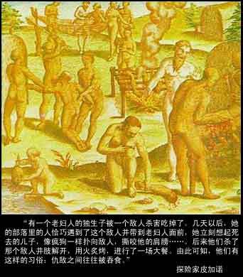 许许多多的男女老少正围绕着火团载歌载舞,男的只穿一短裤,女的半裸着上身,手拿着各种奇形怪状的东西,拍起来敲打起来,似乎是欢乐异常,热闹非凡。旁边不远处,一具血淋淋的、残缺不全的人尸正横陈于地,没有了双手,没有了耳朵。旁边一处草地上,坐着他们的酋长,正把一只血淋淋的手放在嘴里啃起来,草地上还放有脚掌,大腿等,还有许多的白森森的骨头,酋长周围,围坐着3位浑身一丝不挂的女子,有的为其捶背,有的为酋长切割死人大腿上的肉,她们个个殷勤款款,全无胆寒、惊惧的样子,好像这是一餐很普通的用餐,这是很普通的事,整个场面充满着欢乐和热闹的气氛,但也透出森森寒意和杀气。