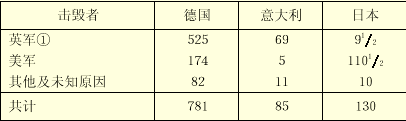 ①英国驻法远征军。 ②不包括在阿比西尼亚的游击队。 ③不包括菲律宾军队。 东方战区和西方战区的分界线画在一条通过卡拉奇的南北线。 以下各地·没·有当作作战地区: 印度西北边境、直布罗陀、西非洲、冰岛、夏威夷、巴勒斯坦、伊拉克、叙利亚。 (1941年7月1日除外)。 马耳他岛作为一个作战地区,从1942年1月到1943年7月,阿拉斯加也作为一个作战地区。 外国分遣队——如自由法国人、波兰人、捷克人——没有包括在内。 我作的另外一个比较表明:大不列颠和大英帝国人员的牺牲甚至比我们英勇的盟国人员的牺牲还要大。英国武装部队的死亡、失踪、被认为是已死亡的人数共达三十万零三千二百四十人,再加上各自治领、印度和各殖民地的十万零九千人,总数达四十一万二千二百四十人。这个数字还未包括联合王国国内死于空袭的六万零五百平民,也未包括大约三万名死亡的商船船员和渔民。与这些数字相比,美国陆军、空军、海军、海军陆战队和海岸警卫队牺牲的人数是三十二万二千一百八十八人①。我之所以列举这些令人伤心的光荣牺牲的人数,是深深相信由这么多宝贵的鲜血所凝成的平等的战友关系,将继续博得英语世界的人们的崇敬,并鼓舞他们的行动。 ①艾森豪威尔:《欧洲十字军》,第1页。 在海洋上,美国当然肩负了太平洋战争的几乎全部重担,1942年,他们在中途岛附近、在瓜达卡纳尔岛以及在珊瑚海所进行的决定性战役,使他们在那辽阔的海洋上获得了全部的主动权,给他们打开了袭击所有被日本占领的地方的道路,并最后袭击日本本土。美国海军是不能同时在大西洋和地中海承担重任的。在这里我有责任摆明事实。在欧洲战区、大西洋和印度洋上击沉的七百八十一艘德国潜艇和八十五艘意大利潜艇中,有五百九十四艘是英国海军和空军击沉的;英国海军和空军除了击毁或俘获意大利全部舰队外,还消灭了德国的全部战舰、巡洋舰和驱逐舰。 把击毁的潜艇数字列表如下: