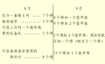 6.这两组数字之间的共同点甚至比乍一看去还要近似,原因是驻扎在紧靠伦敦北面和西北面的后备师既可以部署在瓦什——多佛尔扇形地带,又可以部署在多佛尔——朴次茅斯扇形地带,因此,这两个扇形地带“可用的”师数是可以随时改变的。可供联合扇形地带使用的师共计十五个,而你要求的是十六又四分之三个师。 7.参谋长委员会指出,你的数字是根据来自海上的侵略的规模计算的,而实际的分配情况则把来自空中的侵略也考虑在内。因此,虽然目前南方沿岸的防御似乎稍稍超过于实际的需要,但理由是:我们在那里的防卫部队可能被敌战斗机形成的“幕”所笼罩,敌军可跨过相对说来是比较窄的海峡进行突击。 ※ ※ ※ 正当我们审核这些文件准备付印的时候,情况已开始大变。我们卓越的情报机构证实,希特勒已最后下令采取“海狮”作战计划,并已积极准备。看来此人是要试一试了。况且,攻击的战线和东部海岸完全不同,也就是说是在东部海岸之外的,但是,参谋长委员会、海军部和我仍然一致同意把重点放在东部海岸。 但是,此后的情况急转直下。大批自动推进的驳船和摩托艇开始在夜里渡过多佛尔海峡,沿法国海岸暗中移动,并逐渐集结在加来到布雷斯特一带法国海岸的各个港口。我们每日进行的空中摄影准确地证明了这一行动。已经不可能重新在接近法国海岸的海面布置水雷区了。我们立即开始用我们的小型舰只袭击那些运送部队的船只,轰炸机队集中轰炸新发现的一系列发动侵略的港口。同时,我们得到大量的情报说,德军有一个或几个军正沿这段敌方海岸集结,准备入侵。情报表明敌军铁路运输也很繁忙,并在加来海峡和诺曼底大量集结。后来,据报告,在布洛涅附近有两个山地作战师配备了骡子,显然是要攀越福克斯通悬崖。与此同时,在法国的海峡沿岸出现了大批威力强大的远程大炮。 为了应付新出现的威胁,我们开始把我们的负荷从这条腿转移到另一条腿,并且改进了我们所有的运输条件,以便把我们日益壮大的机动后备队调往南部防线。大约在8月的第一个周末,现任本土部队总司令布鲁克将军指出,南部海岸遭受入侵的威胁也如同在东部海岸一样在增长。我军的人数、效率、机动性和装备也日益增加。 ※ ※ ※ 8月和9月之间,我军部署的变更如下: