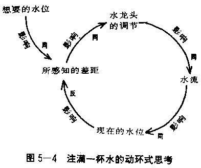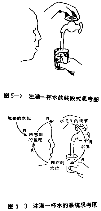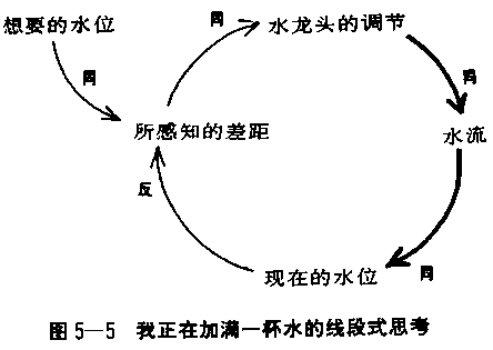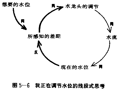 在图5—4中,线段连结起两个要素,其中箭头表示前一项因素对后一项因素的影响。水龙头的调节箭头指向水流;任何对水龙头调节所作的改变,将使水流改变,但是箭头从不单独存在。 为了描述这个动环,我们可以追踪每一项行动的后续影响,像玩具火车绕圈子那般,重复运行。或者可由决策者采取行动的那点开始:“我要调整水龙头的水流,改变水位。水位改变时,我所觉知的差距(现在的与想要的水位之差)改变。当差距改变,我的手在水龙头的调节位置又改变,然后……。”描述这个回馈动环圈的主要技能是看图说“故事”:结构如何造成特别的行为模式,以及行为模式如何被影响而改变。这里的“故事”就是把玻璃杯注满水,并在杯子注水的时候逐渐关紧水龙头。 虽然在概念上是简单的,但是“动环”式的思考打破了根深蒂固的想法——线段式的因果关系。在日常语汇中,当我们说:“我正在加满杯子的水”时,我们并没有很深入思考这句话真正的意思;它意指一项单向的因果关系:我正在使水位上升。或说得更精确些:“我在水龙头上的手,正在控制水流进杯子的速度”。这个陈述显然只描述了一半的回馈过程:从“水龙头的调节”到“水流”到“水位”的连接(见图5—5右半部分)。