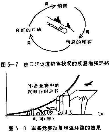“对一个好产品而言,更多的销售等于有更多满意的顾客,等于更多好的口碑。这将带动更多的销售,和比以前传播更广的口碑……,依此循环。在另一方面,如果产品有缺陷,良性循环会转为恶性循环:满意的顾客减少,好的口碑减少,销售量于是减少,好口碑于是更少,销售又更形减少。”(注:见图5—7,如前所述,“同”表改变的方向相同,“反”表改变的方向相反。如循环路绕一圈,“反”字符号的总数为零或偶数,则此环路为增强环路;如循环路绕一圈,“反”字符号的总数为奇数,由此环路为调节环路。此例中“反”字符号之总数为零,故为增强环路。) 由增强环路所造成的行为会加速成长或加速衰退。譬如,军备竞赛造成武器存积的加速成长(图5—8) 成长与危机 五十年代的福斯汽车与八十年代的卡式录影机,便是由于良好的口碑使其销售急速上升。而常发生的银行挤兑风潮则是恶性循环的例子。 我们常听见的语汇诸如“滚雪球效应”、“连锁反应”、“恶性循环”和“贫者愈贫、富者愈富”都是增强环路的例证。企业也常运用它来增强新产品和新组织的信心。然而增强环路常会反向运作,而造成反效果。群众活动便常常受到这种影响。市场口碑也很容易反向操作,而造成销售上无可弥补的损失。 自然界中也可发现增强环路的现象。有个法国童谣描述这种现象:池塘角落最初只有一片荷叶,荷叶的数目每天增加一倍。一共需要30天,整个池塘就会布满荷叶。但是在前28天,根本没人理会池塘中的变化。一直到第29天,村里的人才注意到池塘的一半突然充满了荷叶,而开始关心起来。但这时候他们已无能为力,次日他们所害怕的最坏情形出现了:整个池塘布满了荷叶。这就是为什么环境的危机令人如此担忧的原因;特别是那些由增强环路所产生的危机,在问题被注意到的时候,或许已经太晚了。物种的灭绝也是如此,开始时通常不易发觉,慢慢的加速衰退一段很长的时期后,接着快速绝迹。企业的消失也是如此。 增强环路不会单独一直运作下去,最后一定会遭遇到极限,使成长减缓或停止,或转变方式,或反转方向。荷叶碰上池塘边缘限制的时候,也就停止成长了。“极限”是“调节的回馈”形式之一。“调节的回馈”是系统思考语言的第二项基本元件。 调节的回馈:稳定与抗拒的来源 一个反复调节的系统是一个寻求稳定的系统。如果你处于这种系统中,而系统的目标正好是你所喜欢的,你将感到高兴;如果不是,你将因发现所有的改变又回复原状而感到挫折,直到你能够改变目标或是减弱它的影响为止。 大自然倾向于平衡,但是人类在做决策时,往往与那些平衡的原则背道而驰,也因此付出极高的代价。譬如,管理者在预算压力之下,往往以削减员工人数来降低成本,但是发现结果是使其余的人员工作负荷过量,而成本并未全然下降,因为做不完的工作无论是外包或加班都使成本增加。成本没有降低是因为系统自有它们运行的法则。在这个例子中有一个隐含的目标:预期必须做完的工作量。 一个调节的(或追求稳定的)系统会自我修正,以维持某些目标。加满杯子的水是一个调节的过程,目标是满满的一杯水。雇用新员工是一个调节的过程,目标是预定员工数或成长率。驾驶汽车与骑脚踏车保持稳定也是调节的过程,目标是向预定的方向前进。 调节的回馈环路不胜枚举,他们影响所有目标导向的行为。例如像人体般复杂的有机体,包含了好几千个调节的回馈环路,以维持体温、痊愈伤口、依光的强度调整视力,以及对威胁的警觉等。生物学家会说,这些回馈环路是使我们达成稳定体内状态的机制,也就是在变动的环境中维持生存的能力。当我们需要食物的时候,调节的回馈提醒我们吃东西,当我们需要休息的时候,提醒我们睡觉,或如图5—9所示,当我们冷的时候,提醒我们穿上毛衣。(在本书中,调节环路均以一个“天平”的图形来表示。) 就像在所有的调节过程中,我们的体温朝向期望的温度逐渐地调整(图5—10)。