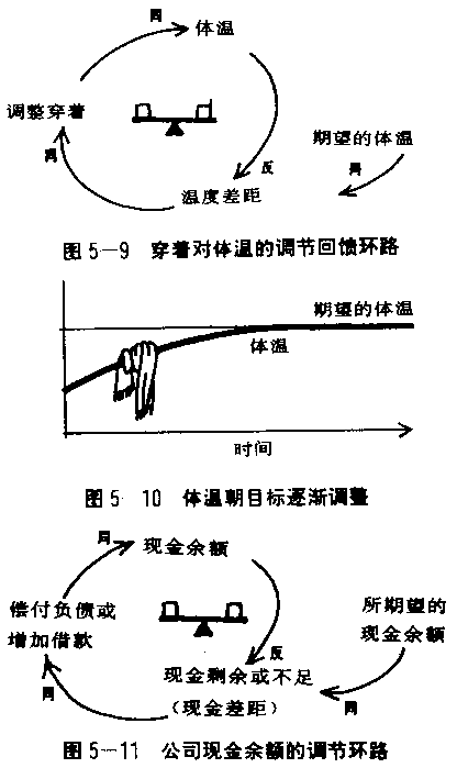 组织与社会都是复杂的有机体,他们也有无数调节的回馈环路。在公司,生产与材料订购流程不断在调整,以回应所收到订单的变动;短期(打折扣)与长期(标价)价格也要调整,以回应需求或竞争者的价格变动;借贷必须随现金余额或资金周转需要的变动而调整(图5—11)。 事前的计划可产生较为长期的调节环路。例如人力资源汁划可以建立人员和技能的长期成长目标,以配合所预期的需要;市场调查与研发计划可以引导新产品的发展,及对人员、技术、设备的投资,以建立企业长远的竟争优势。