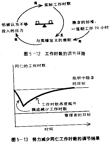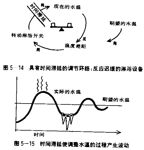 在管理中,调整的工作之所以如此困难,是因为有些目标往往很难察觉,而使得调节的环路无法加以辨认。我回想起一位好友,努力尝试在他迅速成长的企管顾问公司中,使同仁们不要过度工作。他写备忘录、缩短工作时数、甚至提早下班并锁上办公室,这一切都是想要让员工不再工作过度。但是这些行动都无法奏效。员工忽视备忘录、违背缩短工作时间的规定,并因办公室被锁上而把工作带回家。这是因为在他的组织内部有一个不成文的标准:“真正的”英雄是关心组织、力争上游、一个星期工作七十小时的人。这是我的朋友因自己旺盛的精力和长时期工作,在无形中所建立起来的标准(图5—12、5—13)。 要了解有机体如何运作,我们必须了解它的调节环路,包括明显的和不明显的。那就好像我们虽然能够了解身体各部分的器官、骨头、脉、血管,但是我们并不会了解身体到底是如何运作的;一定要当我们了解神经系统如何维护平衡,以及循环系统如何维持血压与氧气水平,才能一窥人体系统运作的情形。许多完全由国家操控的集体社会或经济制度不能成功,便是因破坏了自由市场体系中多重的自动调节环路。公司合并常常失败,也是因为破坏了原有的调节环路。美国波士顿有两家医院,原先都有悉心照料病患的优良传统,几年前两家医院合并,合并后的医院有最先进的科技设备,但是失去原有对病人的亲切照顾与员工的忠心。两家医院原有的服务品质、重视员工、跟病人维持友善关系的微妙调节环路,被新的行政结构与程序切断了。 工具箱三:如何描述调节环路 让我们再回到图5—11,它是一个调整现金不足或过多时的调节环路。 要了解这个环路,通常最容易的作法是以目标与现状间的差距作为起点: “这里我们所需现金流量有短缺的现象。”(换句话说,我们所期望的现金余额与实际的现金余额有差距。) 然后我们看看调整上述差距所采取的行动: “我们增加借款,以增大我们的现金余额,使差距减少。” 图5—11显示调节的环路总是朝向减少目标与现状之间差距的方向操作。并且,所期望的现金余额还可以进一步地随着企业的成长或衰退而变动。也就是说,调节环路亦会追踪变动中的目标,继续不断地调整现状。 虽然在概念上是简单的,但若调节环路未被发现,会产生出人意料而非常棘手的问题。通常调节环路比增强环路更难看出来,因为它看起来像是没什么事情发生。甚至在所有参与者都已感觉到,并想要改变平衡流程时,它仍会维持现状。那种感觉,就像尽管你奋力地奔跑,所能得到的结果却是留在原地。当你有这种感觉时,一个调节环路可能就在附近。 企图从事组织变革的领导者,常发现他们自己身不由己地陷入调节环路中无法脱身。领导者总觉得他们的努力跟不知来自何处的突发性抗拒发生冲突。事实上,就如我前面所说的那位顾问界的朋友那般,当他试着去减少同仁过度的工作时,系统便会产生抗拒的反应,尝试着维持一个隐含的系统目标。如果这个目标不被辨识出来,改变的努力是注定要失败的。那位领导者的行为模式被当成模范,如果他真想改变系统,他必须改变他的习惯,或建立新的模范。 只要有“难以改变”的情况,就可能有一个或更多隐藏的调节环路存在。“难以改变”并不是神秘难料的,而是有一些“隐含的规范”在影响着调节环路。与其更努力的行动以克服“难以改变”的情况,懂得领导艺术的人明辨抗拒的来源,他们直接针对隐含的规范、成见、传统习惯或习以为常的做法着手。 时间滞延:终于…… 系统好像是活的,有他们自己的心智,这从系统中的时间滞延效果最易看出。时间滞延是指行动与结果之间的时间差距。它会使你严重的矫枉过正,不是太过,就是不及,但如你看清它们,并善加运用,也能够产生正面的效果。 类比元件的总裁史塔达说:“改善系统最有效的方法之一,是把系统的时间滞延减到最低限度。”史塔达提到美国的制造业渐渐领悟,当他们还以传统方式控制库存时,他们的日本对手已倾全力在减少时间滞延,这是一项更成功的努力。波士顿顾问公司(Boston Consultinge Group)的副总裁史塔克(George Stalk)说:“新一回合的竞争优势来自于妥善的管理时间,不断缩短在生产、新产品开发、销售与配销方面的时间。”在人类的系统之中,行动与结果之间的时间滞延到处都是。我们现在的投资要到遥远的将来才获利;今天雇用一个人,或许要好几月后才能发挥生产力;为新计划投入的资源,可能在几年后才能回收。但是时间滞延常常未被察觉而引起动荡。譬如第三章中啤酒游戏的决策者便是一个最典型的例子。 时间滞延是在一个变数对另一变数的影响,需要一段时间才看得出的情形下发生的。时间滞延是构成系统语言第三个基本元件。实际上所有回馈流程都有某种形式的时间滞延。但是时间滞延常未被察觉或充分了解,而使得企图改善的行动矫枉过正,超过了预定的目标。以进食为例,当我们应当停止的时候,却感到还没吃饱,于是继续吃直到太撑为止。新建设计划的开始,到完工之间的时间滞延,造成不动产市场的过多,终而暴跌。啤酒游戏中,发出订单与收到所订啤酒之间的时间滞延,经常造成订购过多。 工具箱四:如何描述时间滞延 图5—14显示一个淋浴设备带有时间滞延时的调节环路。 这是一个老旧的水管,从转动水龙头到看到