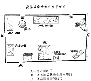 波洛在里面锁上了门,对房间进行了仔细的检查。他象蚱蜢一样灵活地从一件物品蹦向另一件物品。我怕抹掉什么线索,一动不动地站在门边。然而,波洛对于我的克制态度,似乎并无感激之意。 “你怎么啦,朋友?”他大声嚷道,“你站在那儿象个——那叫什么来着?——啊,对了,干么象根木桩子呀?” 我解释说,我怕抹掉什么足迹之类的东西。 “足迹?亏你想得出!这房间实际上就象来过一支军队了!我们还能找出什么足迹来呀?别站在那儿了,来,帮我一起来搜查吧。在我要用它之前,得先放下我的小公文箱。 说着,他把小箱子往窗边的圆桌上一放,可是动作猛了一点,结果由于桌面是松动的,它一边向上翘了起来,猛地使公文箱摔落到地板上。 “瞧这桌子!”波洛叫了起来。“嗨,我的朋友,一个人有可能住一幢大房子,可是也可能并不舒适。” 在作了一番说教之后,他重又开始检查。 写字台上有一只紫红色的小公文箱,箱于的锁上插着一把钥匙,这一时引起了他的注意。他从锁孔中拨出钥匙,递给我作检查。可是我看着并无特别之处。这是一把普通弹簧锁的钥匙,捏手的地方扎着一段拧在一起的金属线。 接着,他又检查了已被我们推破的门框,弄清楚插销确实被毁坏了。然后他又走到对面的通向辛西娅房间的门边。正如我所说的那样,这扇门也是闩住的。可是,他却拉开了插销,把门打开又关上,试了好几次;试的时候,他十分小心,尽量避免发出任何声音。突然,插销上的什么东西似乎引起了他的注意。他仔细作了检查。于是,敏捷地从自己的箱子里取出一只镊子,夹起一点极小的东西,小心翼翼地把它放进一只小小的封袋。 五斗橱上搁着一只托盘,盘子里有一盏酒精灯,上面放着一只小小的长柄平底锅。锅子里还留有少量发黑的液体。一只已经喝尽的空怀子和茶托摆在它的旁边。 我自己也感到奇怪,我怎么会这样粗心,连这都给看漏了。这儿有这么一个有价值的线索。波洛灵巧地伸出一个指头往液体里蘸了一下,然后小心翼翼地尝了尝。他装出一副怪相。 “可可——里面还掺了——我想是——糖酒。” 床边的一张小桌已经翻倒在地,他走到掉落在地板上的那摊东西跟前。一盏台灯,几本书,一些火柴,一串钥匙,一只打破的咖啡怀的碎片,撒得满地都是。 “啊,这可怪了,”波洛说。 “我得承认,我看这没什么特别奇怪的地方。” “你不感到奇怪?看这台灯——玻璃罩只跌破两处,它掉下来时,就跌成这样子。可是你看,这咖啡杯跌得完全粉碎了。” “是呀,”我显得有点不耐烦他说,”我猜想一定是什么人踩上去过了。” “确实如此,”波洛用一种奇怪的声音说。“有个人踩过它。” 他站起身来,缓步走到壁炉台眼前,站在那儿心不在焉地摆弄着上面的礼拜用品,把它们理整齐——这是他心中焦虑时的一种习惯。 “我的朋友,”他转身对我说,”有人踩过这只杯子,有意把它碾成了粉未,而他们这样干的理由不是因为杯子有士的宁,就是因为——那就严重得多了——杯子里没有士的宁!” 我没有搭腔,这可把我搞糊涂了,可是我知道现在不便要他解释。过了一会,他又振作起精神,继续进行侦查。他从地板上捡起那串钥匙,捏在手上迅速地转了几圈,最后终于选中了雪亮发光的一只。他想用它来打开紫红色公文箱上的锁。它刚好合适,于是他打开了箱子,可是犹豫了一下后,他又把它关了回去,重新锁上,同时,也把这串钥匙,如同原来插在锁上的那把一样,塞进自己的口袋。 “我无权检查这些文件,但是这必须马上进行!” 接着,他又非常仔细地检查了脸盆架的抽屉。在他穿过房间,走向左边的窗口时,深咖啡色地毯上圆圆一滩不十分明显的污渍似乎特别使他发生了兴趣。他蹲下来检查了一会——甚至还扑到近旁闻了闻。 最后,他又倒了几滴可可到试管里,仔细地封上管口,然后掏出一本小小的笔记本。 “在这个房间里,”他说道,一边匆忙地写着:“我们发现了六个值得注意的疑点。要我列举一下吗?还是你说?” “哦,你来。”我急忙回答说。 “那好吧。第一,一只已被碾成粉未的咖啡杯;第二,一只锁上插着钥匙的公文箱;第三,地板上的一滩污渍。” “那也许是一些时候以前弄的。”我打断了他的话。 “不,因为它着得出还是湿的,而且还有咖啡的香味。第四,一点深绿色织物——只有一两根纱,但可以认出。” “啊!”我叫了起来。“就是你夹起放进小封袋那东西。” “是的,结果也有可能是英格里桑太太自己的一件衣服上钩下来的,那就毫无价值。我们将会弄清楚的。第五,就是这个!”他用一种演剧般的姿势指着写字台旁的地板上一大片蜡烛油说。“这一定是昨天滴下的,要不,会有个好女仆马上用吸油纸和熨斗把它给去掉的,有一回我的一顶最好的帽子——但这和这事无关。” “很可能是昨天晚上滴下的。当时我们都很焦急不安。不过也有可能是英格里桑太大自己滴的。” “你们只拿了一支蜡烛到房里来吧?” “是的。是劳伦斯·卡文迪什拿着的。当时他心神干分不定。象是看到那边有什么东西,”——我朝壁炉台方向指了指——“使他吓得目瞪口呆。” “这倒有意思了,”波洛马上说,“是呀,这很有启发,”——他的目光扫视着整堵墙壁——“不过这一大片蜡烛油可不是他手上的那支蜡烛滴的,因为你看到了,这是白色的,而劳伦斯先生的那支,现在它还在梳妆台上,是粉红的